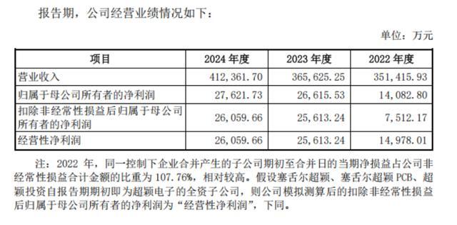 随着大数据、云计算、5G通信等新一代信息技术的发展、新能源汽车市场渗透率的提高、下游新兴产业需求的增长,公司业务呈现良好发展态势。在2022-2024年度,超颖电子营业收入分别为351415.93万元、365625.25万元和412361.70万元,业绩持续增长,盈利能力持续增强;同时公司归属于母公司所有者的净利润分别为14082.80万元、26615.53万元和27621.73万元,具备良好的持续经营能力。